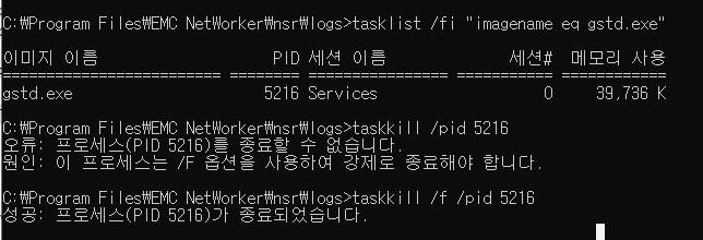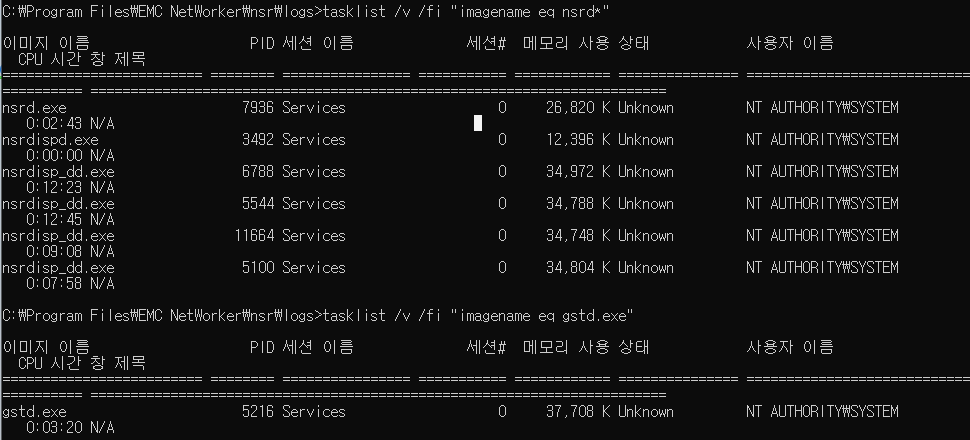 명령어 예) C:\Program Files\EMC NetWorker\nsr\logs>tasklist